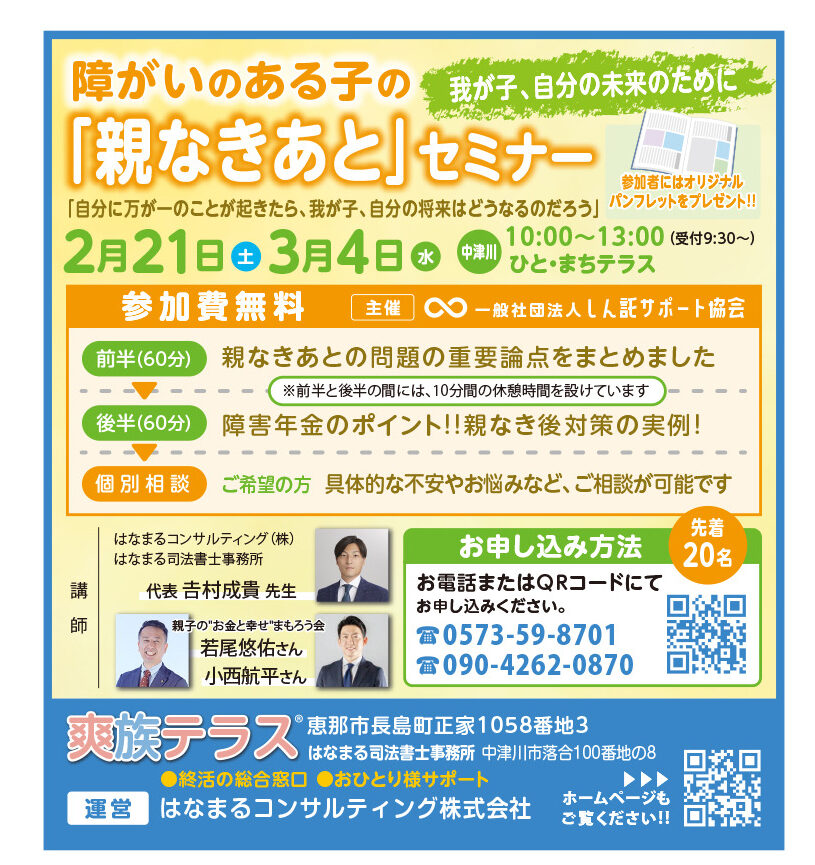 2月21日(土)3月4日(水)10時~13時 ひと・まちテラスにて”親なきあとセミナー”を開催します。